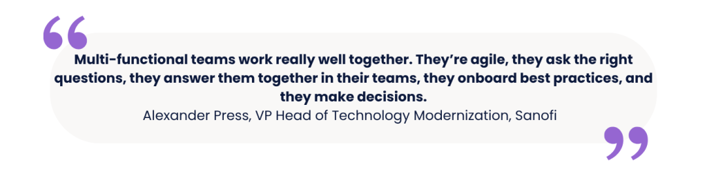Speaking alongside Alan Guthrie, Alexander Press, the VP Head of Technology Modernization at Sanofi, framed the modern CIO as “technology ambassadors in the triangle of technology, process, and organization”.