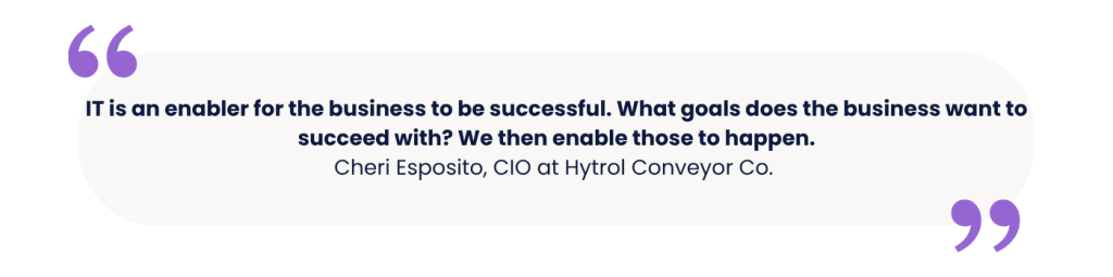 Echoed across the pond at CIO Boston the following week, Cheri Esposito, CIO at Hytrol Conveyor Co., stressed the CIO’s role as “a business transformation leader.”